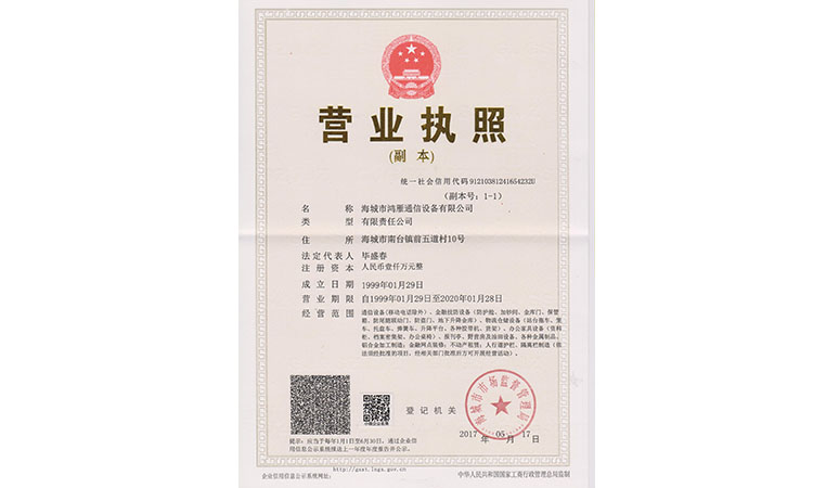 海城市鴻雁通信設備有限公司成立于1985年,位于海城市鞍海公路東側,交通便利。注冊資金1000萬,占地面積17800平方米,職工120人,年產值600多萬。法人代表畢盛春,曾多次獲得“中國誠信企業家”稱號。